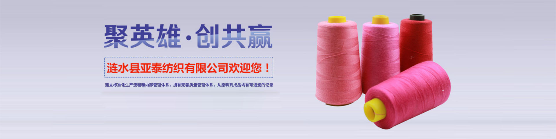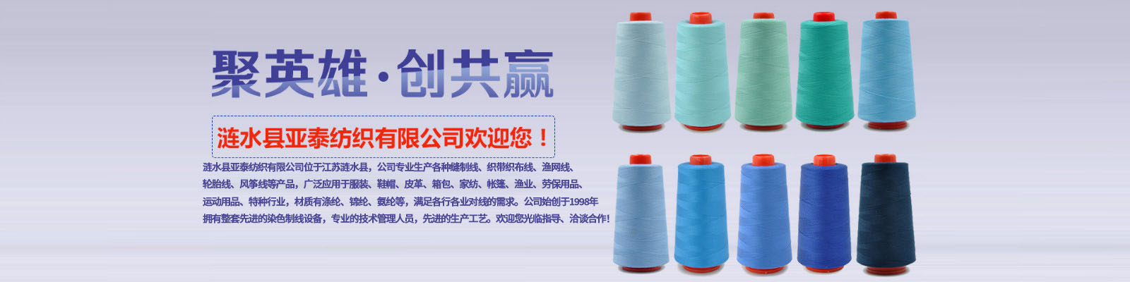 漣水縣亞泰紡織有限公司位于江蘇漣水縣,公司專業(yè)生產(chǎn)各種縫制線、織帶織布線、漁網(wǎng)線、輪胎線、風(fēng)箏線等產(chǎn)品,廣泛應(yīng)用于服裝、鞋帽、皮革、箱包、家紡、帳篷、漁業(yè)、勞保用品、運動用品、特種行業(yè),材質(zhì)有滌綸、錦綸、氨綸等,滿足各行各業(yè)對線的需求。公司始創(chuàng)于1998年,擁有整套先進(jìn)的染色制線設(shè)備,專業(yè)的技術(shù)管理人員,先進(jìn)的生產(chǎn)工藝。歡迎您光臨指導(dǎo)、洽談合作!